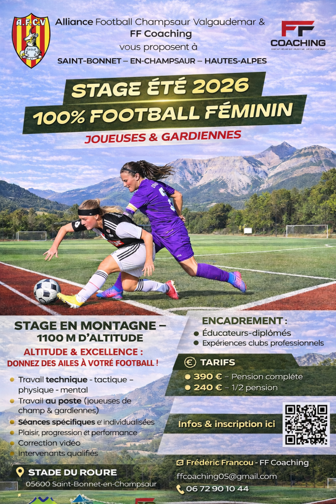 Tu es une joueuse de football ? Je te propose de nous rejoindre, cet été, en Altitude à Saint Bonnet En Champsaur (05) pour 3 jours de stage de perfectionnement TOTAL pour intensifier ta passion.